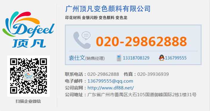 頂凡變色顏料專注變色顏料13年,公司產(chǎn)品包括溫變粉,光變粉,銅金粉,銅金漿,夜光粉,熒光粉,反光粉等變色顏料,可定制生產(chǎn)。